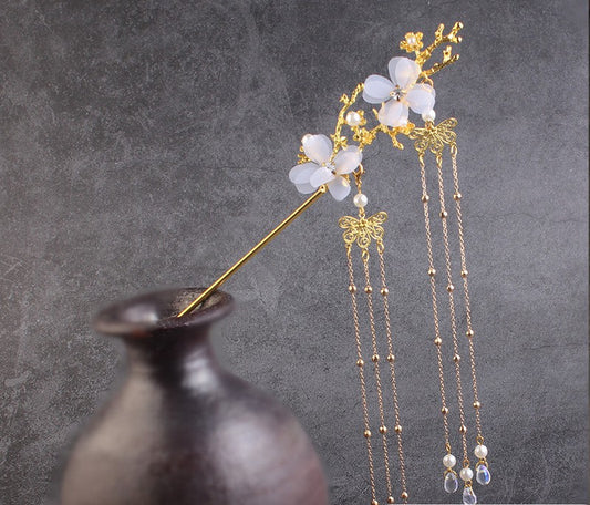 Ancient Style Hair Accessories Hanfu Plum Blossom Branch Tassel Hairpin White Flower Drill